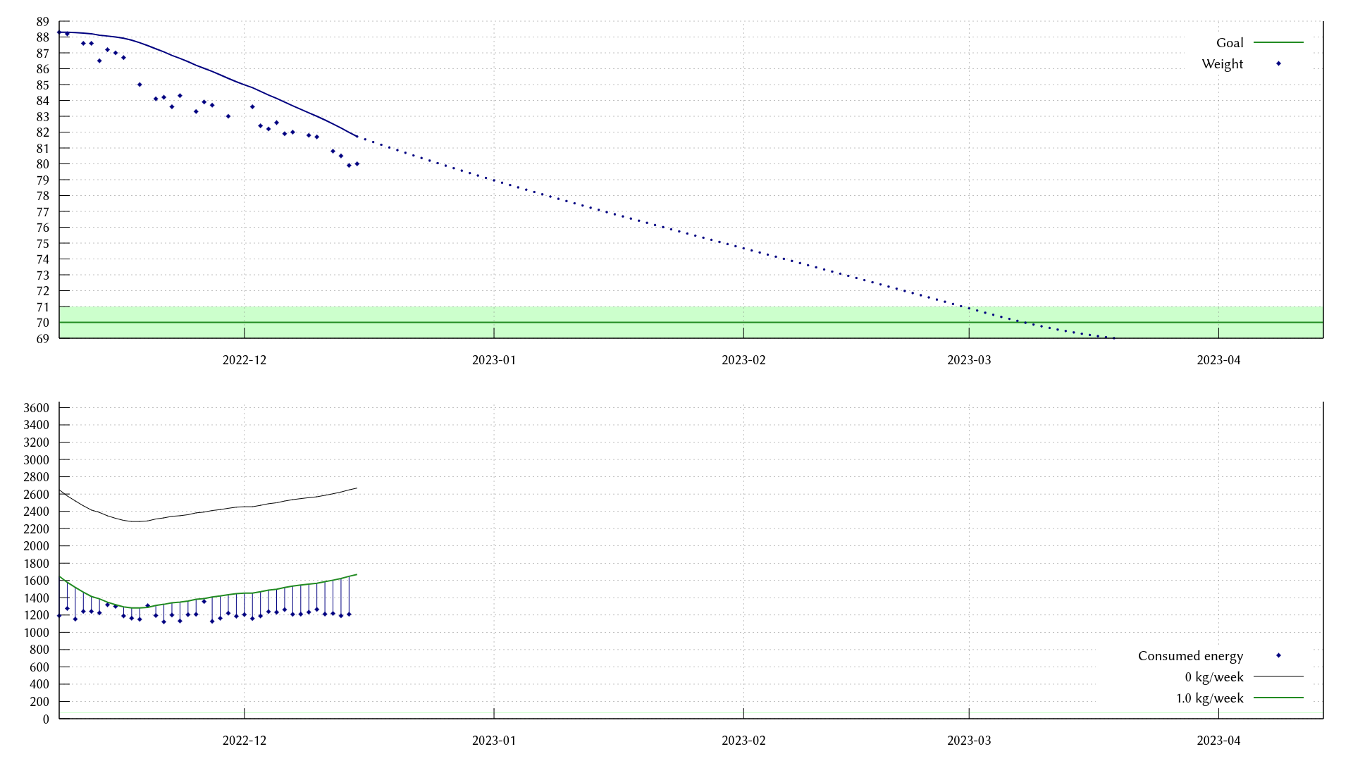 Graph that shows how my weight changed from 88 kg to 80 kg in the last ~1.5 months. On the bottom half, a graph that shows that I ate around 1200 kcal pretty regularly.