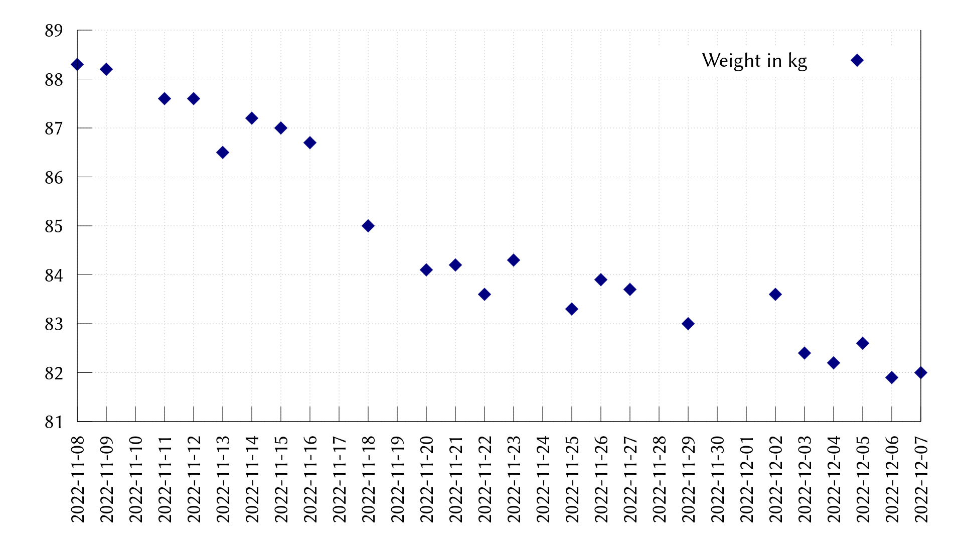 A weight graph over the past month, with the weight dropping from 88 to 82 kg.