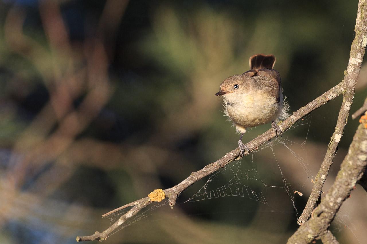A Buff-rumped Thornbill perched on a stick. It has a pale underside, brown upper and a white/grey eye. Once again, a dark short thorn-like beak.