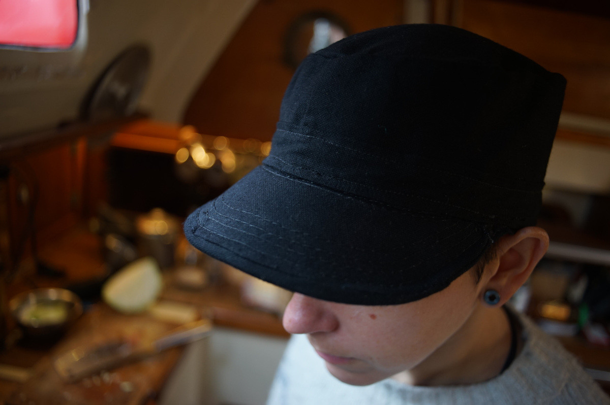 rek is wearing a black cap they just put together out of 12 oz cotton canvas. The angle shows the topside of the cap.