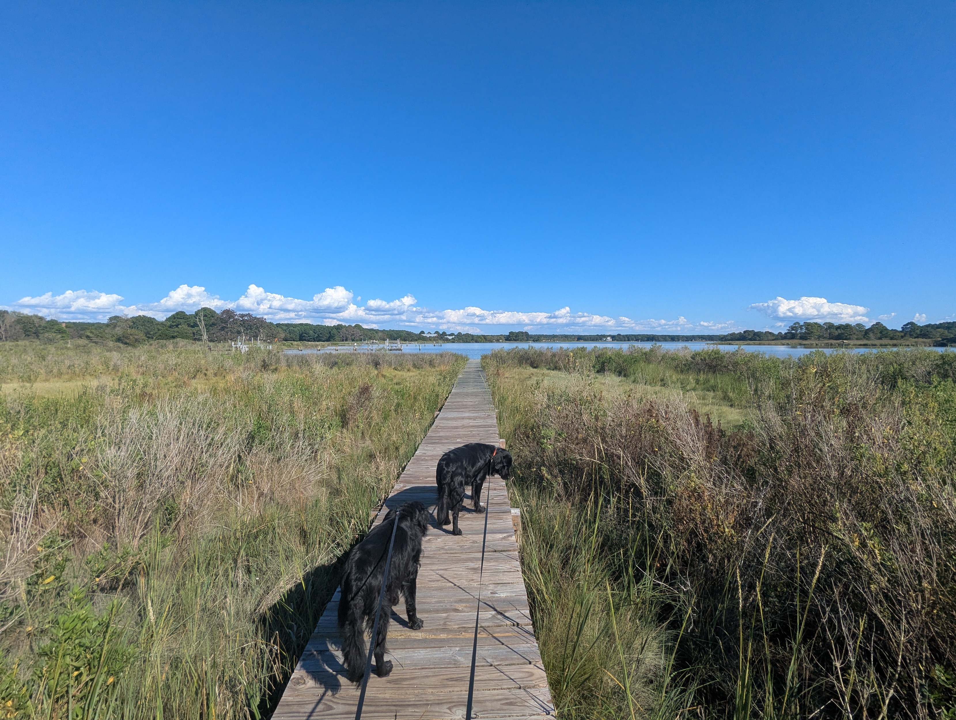 Photo of a fine early September day on Harris Creek, sky is deep blue with puffy white clouds riding the horizon. Marsh is browning and gone to seed. Creek water is rippled and reflects the sky and clouds. In the foreground Miles and Jon two black Flat-Coated retrievers stroll down the wood walk in hopes of spotting interesting waterfowl.
