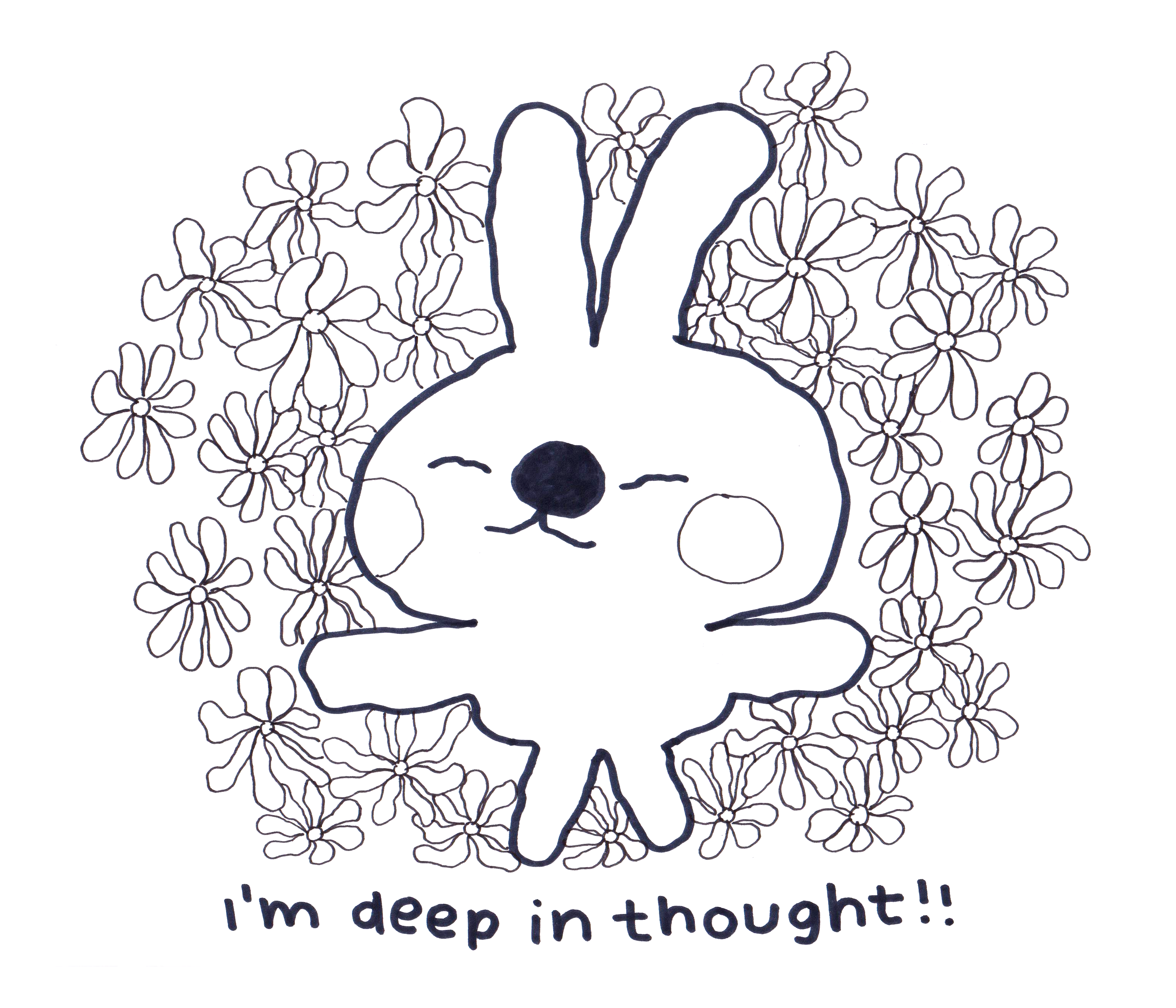 A smiling bunny closes its eyes among many flowers. Text reads: "I'm deep in thought!!"