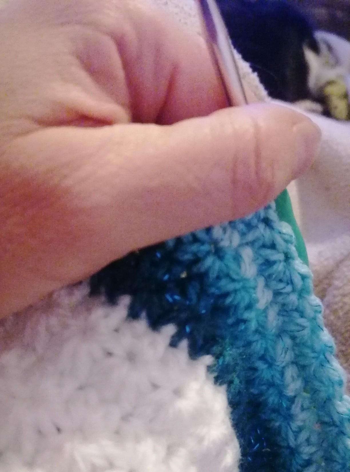 Punto stella all'uncinetto. Sullo sfondo, gatto acciambellato ai miei piedi