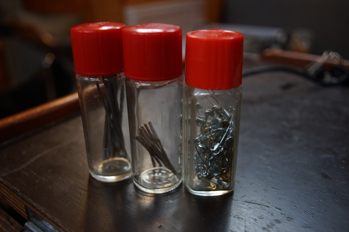 3 empty bottles of shichimi togarashi, 1 holding sail needles, another sewing machine needles, and the third safety pins.