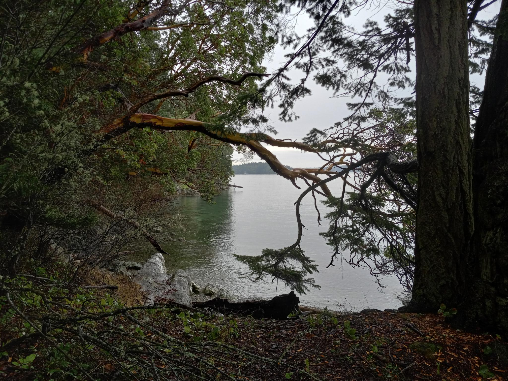 A gorgeous view of a rocky beach, underneath some curvy red arbutus trees and straight cedar trunks. The sky is cloudy, and the water is beautiful green-blue.