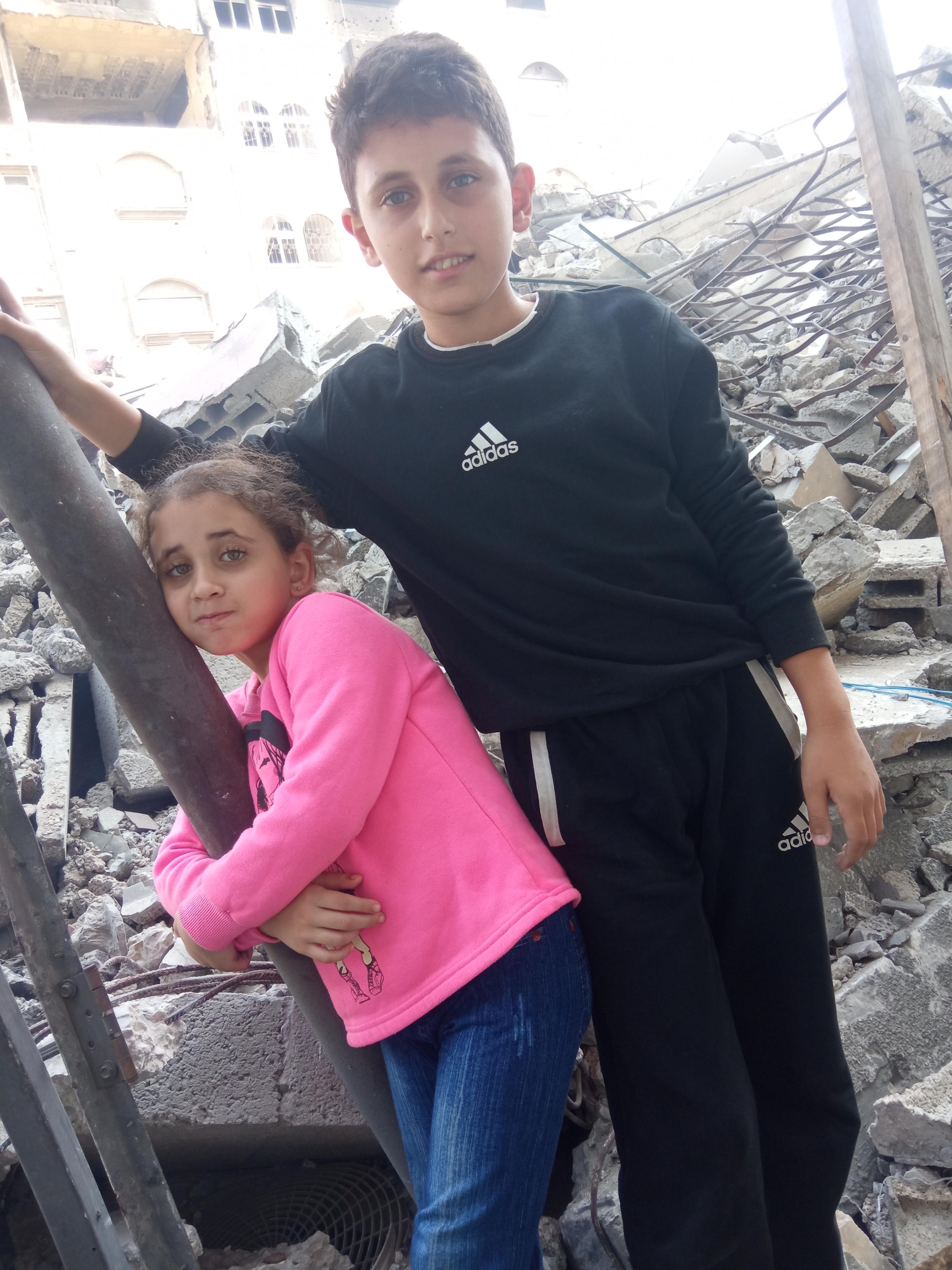 Adam and Lana stand in front of destroyed house