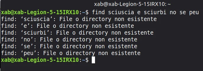 terminale di linux mint con il tentativo di ricerca di sciuscia e sciurbi no se peu