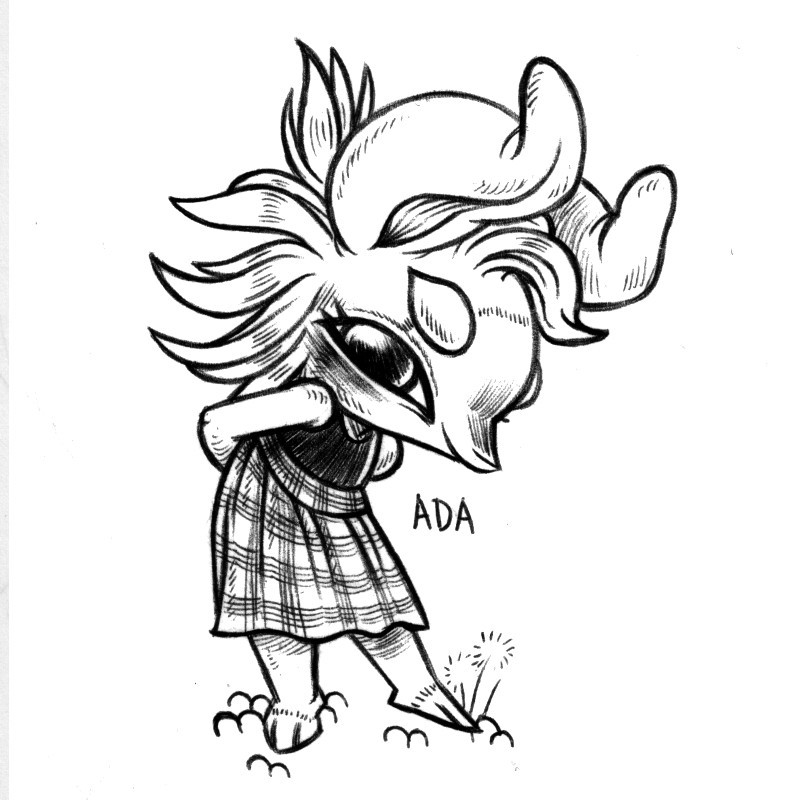 an ink drawing of a humanoid rabbit named Ada, standing with their arms crossed on their back. They are wearing a long plaid skirt and a black sleeveless top.