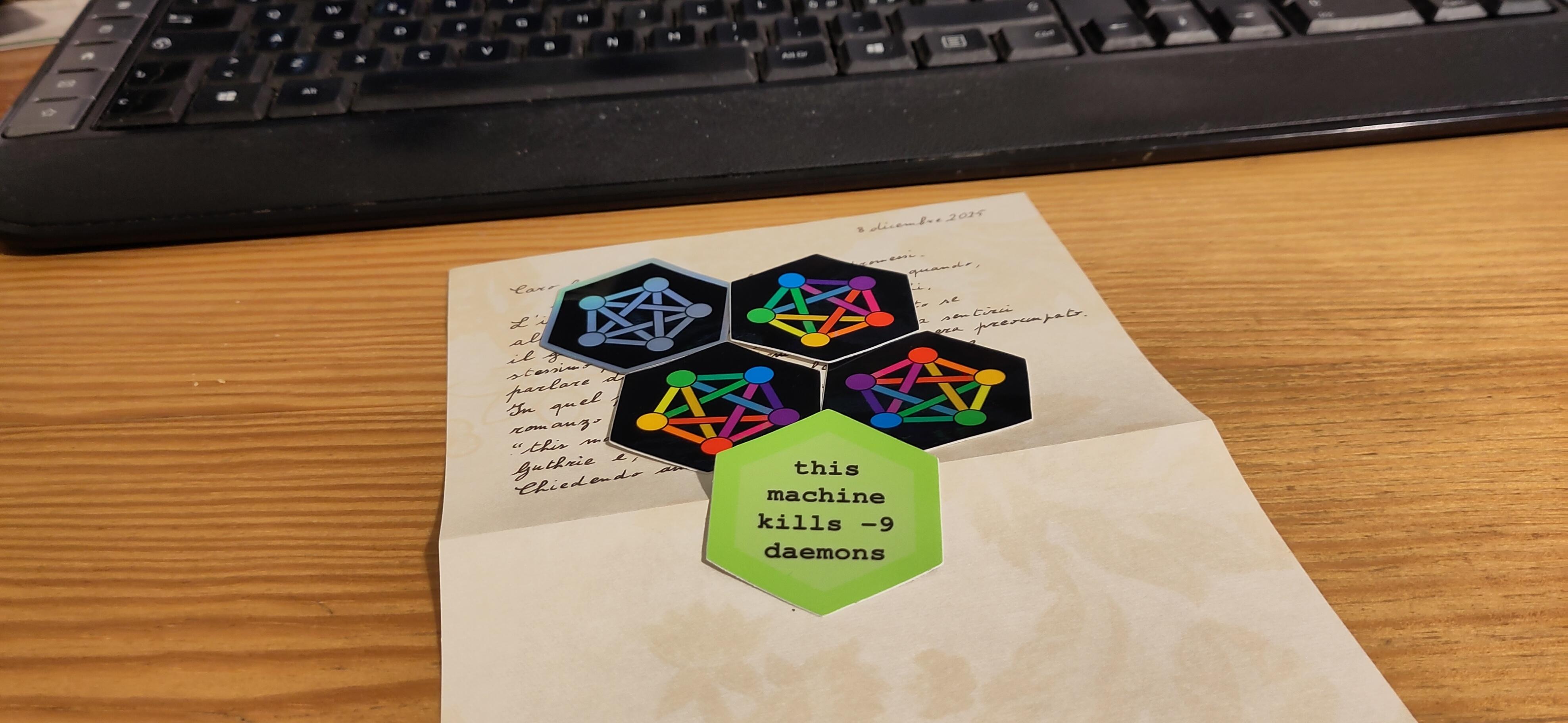 una lettera scritta a mano poggiata su una scrivania di legno davanti una tastiera, con degli adesivi esagonali con il logo del fediverso sopra, ed uno uno che recita "this machine kills -9 daemons"