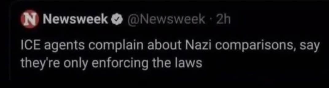 Newsweek @Newsweek. 2h ICE agents complain about Nazi comparisons, say they're only enforcing the laws