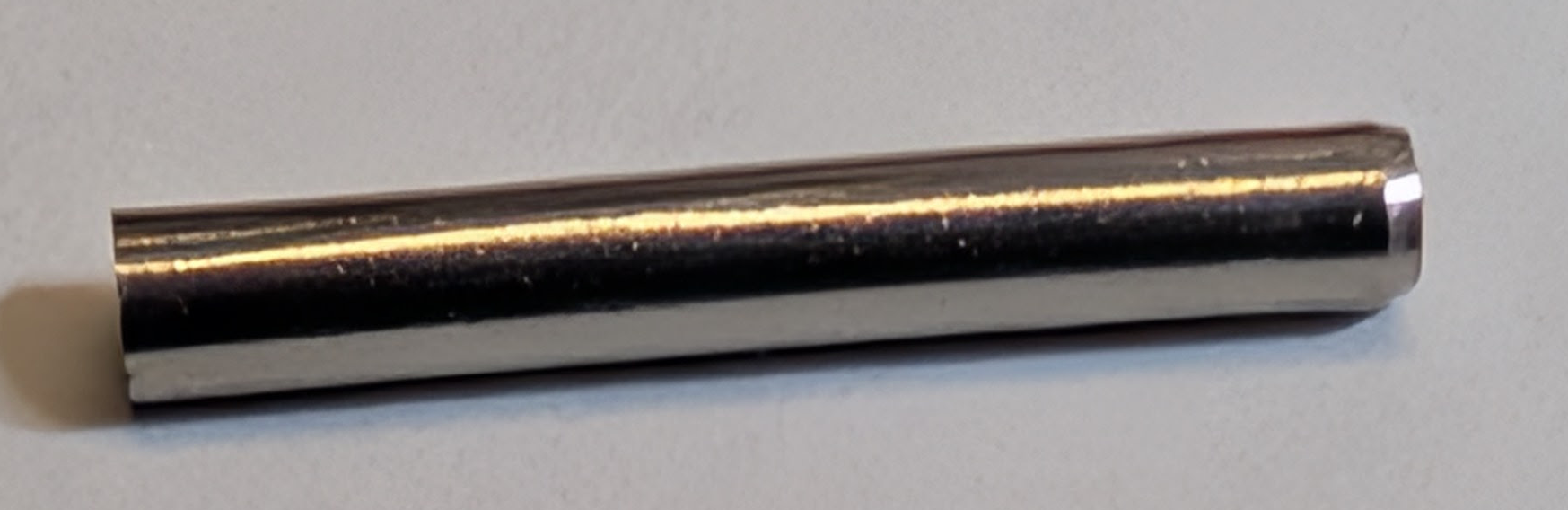 close-up view of roll pin. Only one end is tapered, and the pin is not straight.