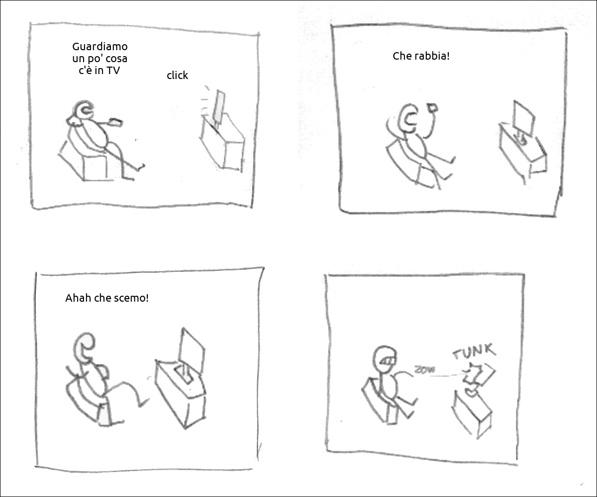 un tizio guarda la tv e dice: «Guardiamo un po' cosa c'è in TV» la TV fa click il tizio è innervosito e dice: «Che rabbia!» il tizio ridendo dice: «Ahah che scemo!» il tizio lancia il telecomando alla TV