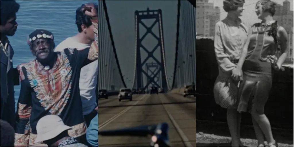 A triptych frames from motion picture film shot around San Francisco over its history: left shows a man in a colorful outfit by water, center shows two-way traffic atop on the Bay Bridge, and right shows two women in 1920s type attire on a rooftop.