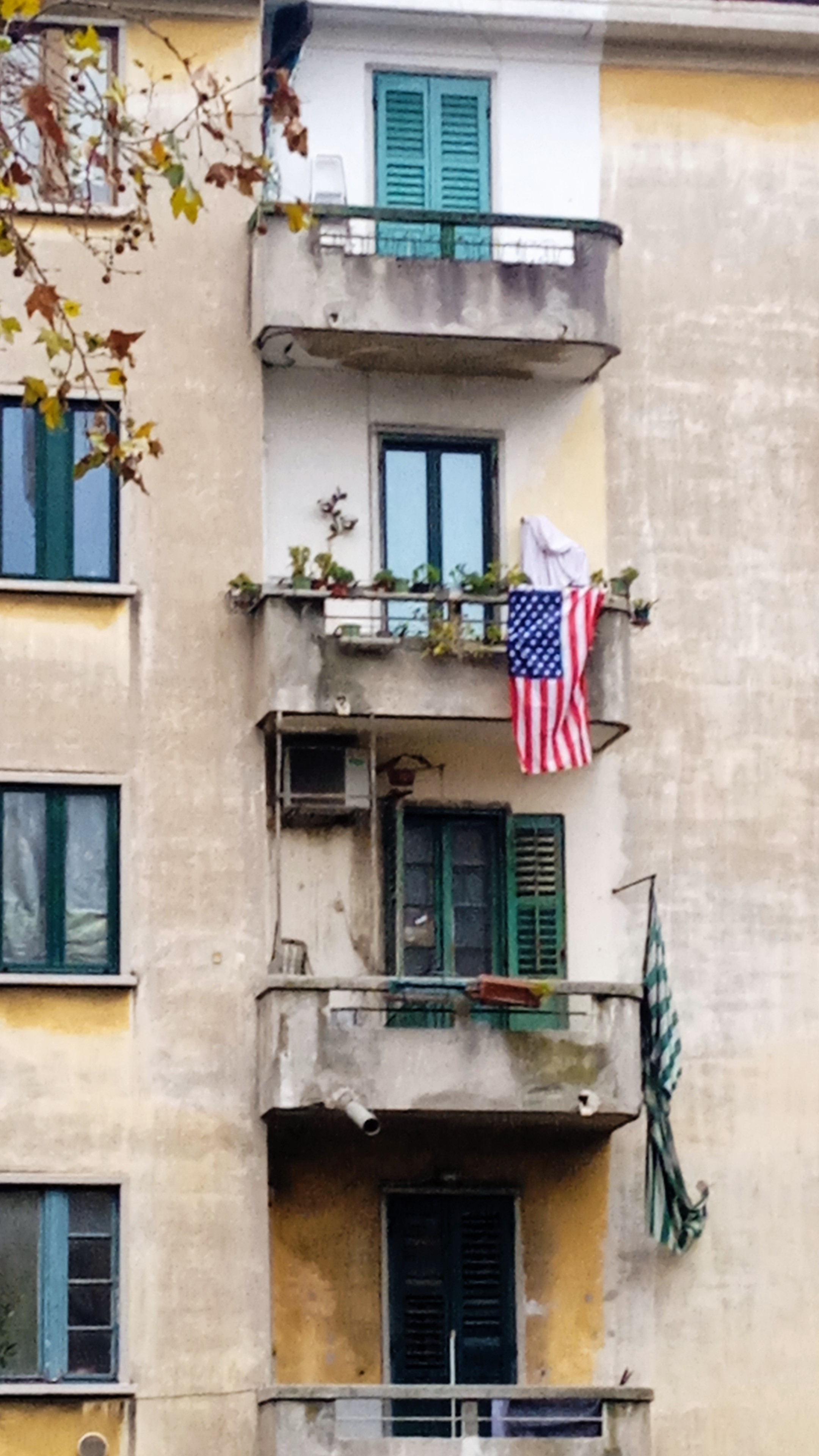 A dilapidated apartment building with an American flag hanging from a balcony