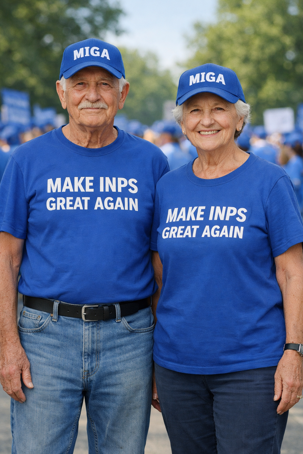 Due anziani visti frontalmente a figura intera, un uomo e una donna, che indossano dei cappelli e delle t-shirt blu e dei berretti blu da baseball, come se si trattasse di manifestanti. I cappellini riportano la scritta MIGA, le maglie la scritta "MAKE INPS GREAT AGAIN". Sfondo con una folla sfocata sempre suo toni dello stesso blu. Pieno giorno con alberi in sfondo.