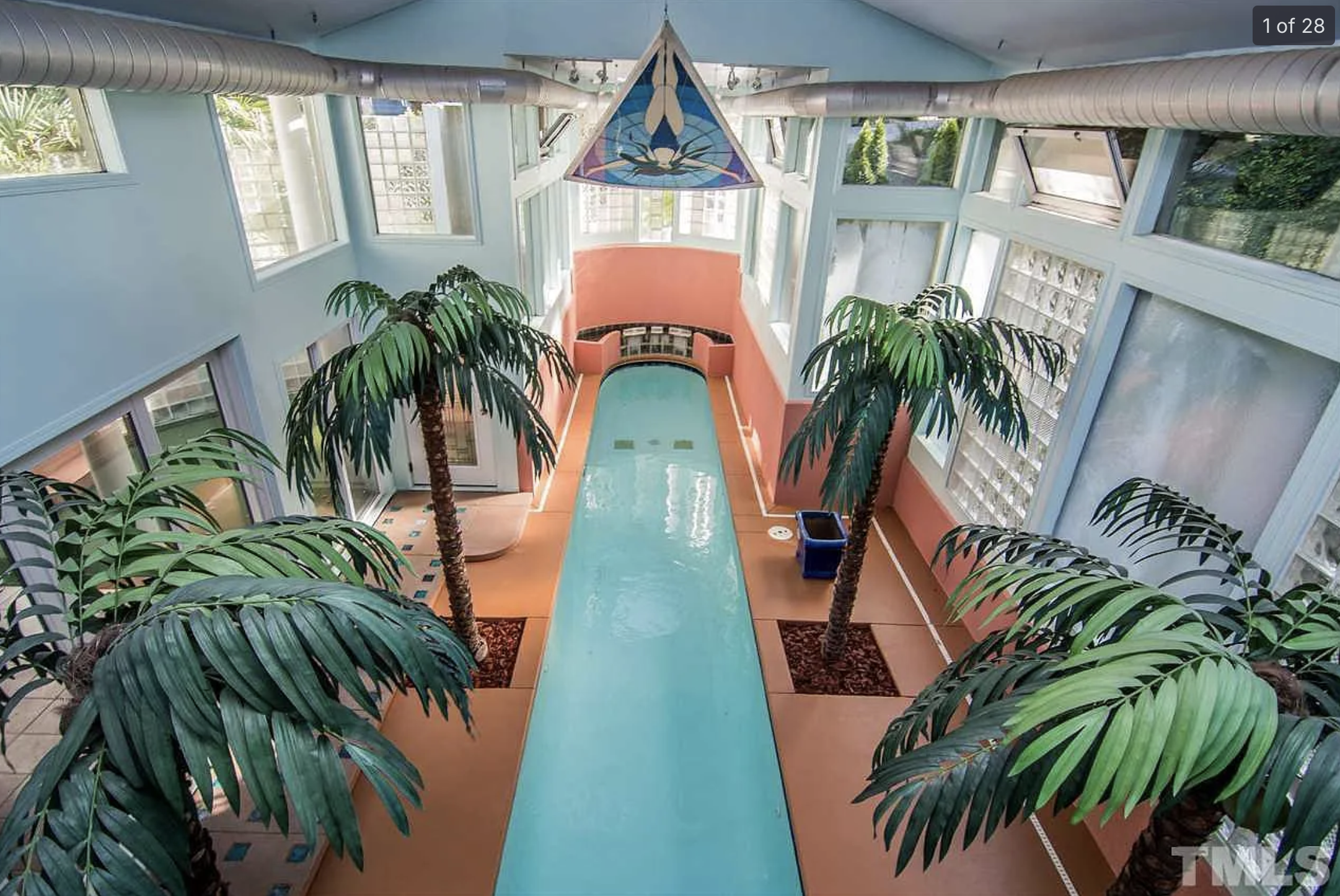 An indoor pool that is very long and narrow and round at the end, with fake palm trees along either side and a triangle banner hanging down of a woman diving into a pool.