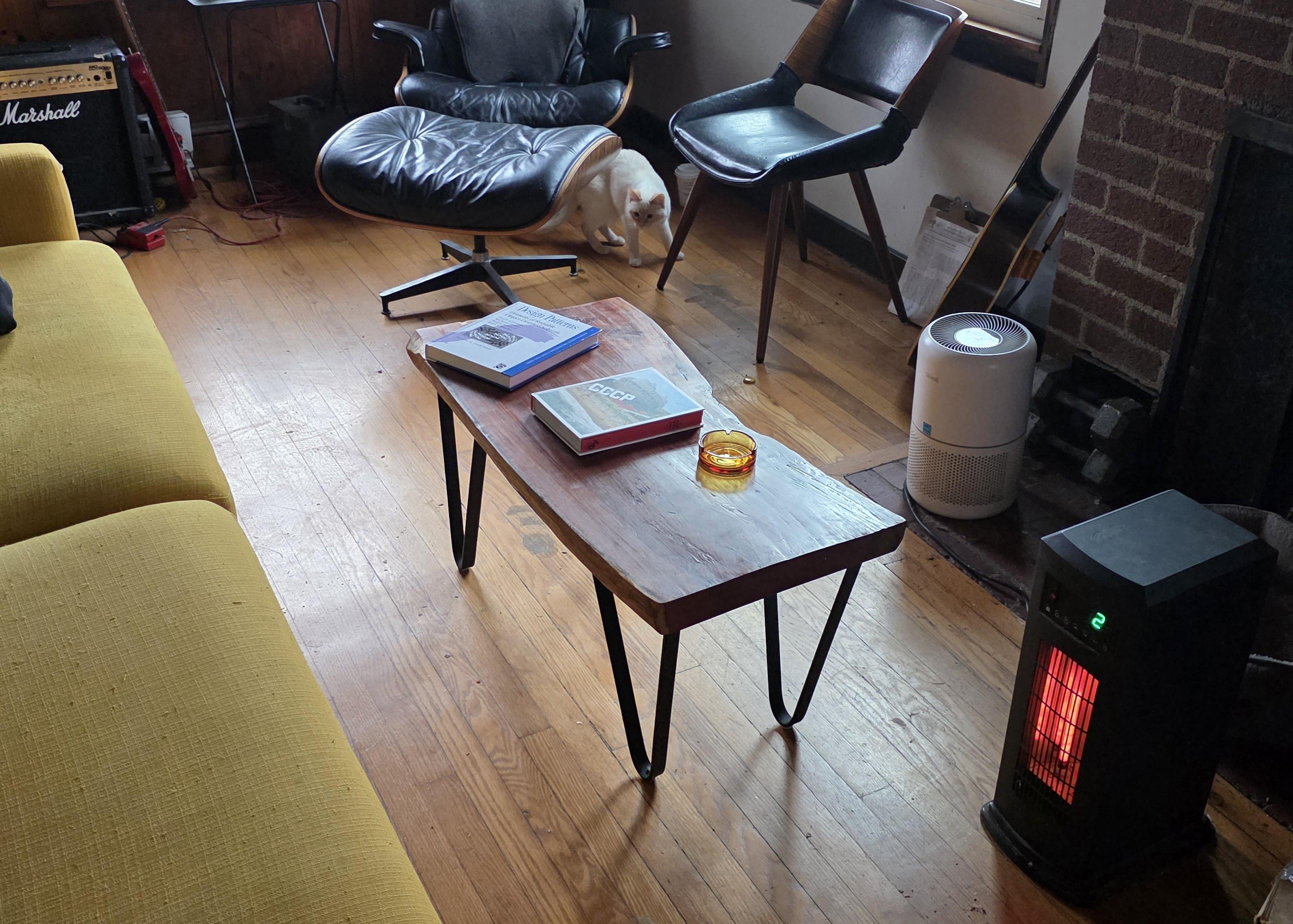A coffee table made from a live-edge slab of hardwood and four hand-bent steel bar legs.