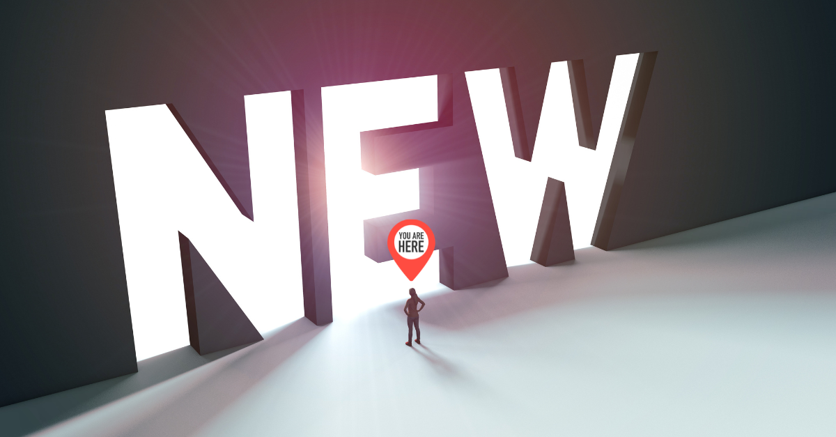Silhouette of a person standing before a large, illuminated, all-caps word: NEW. Hovering over its head is a βYou are hereβ map pin.