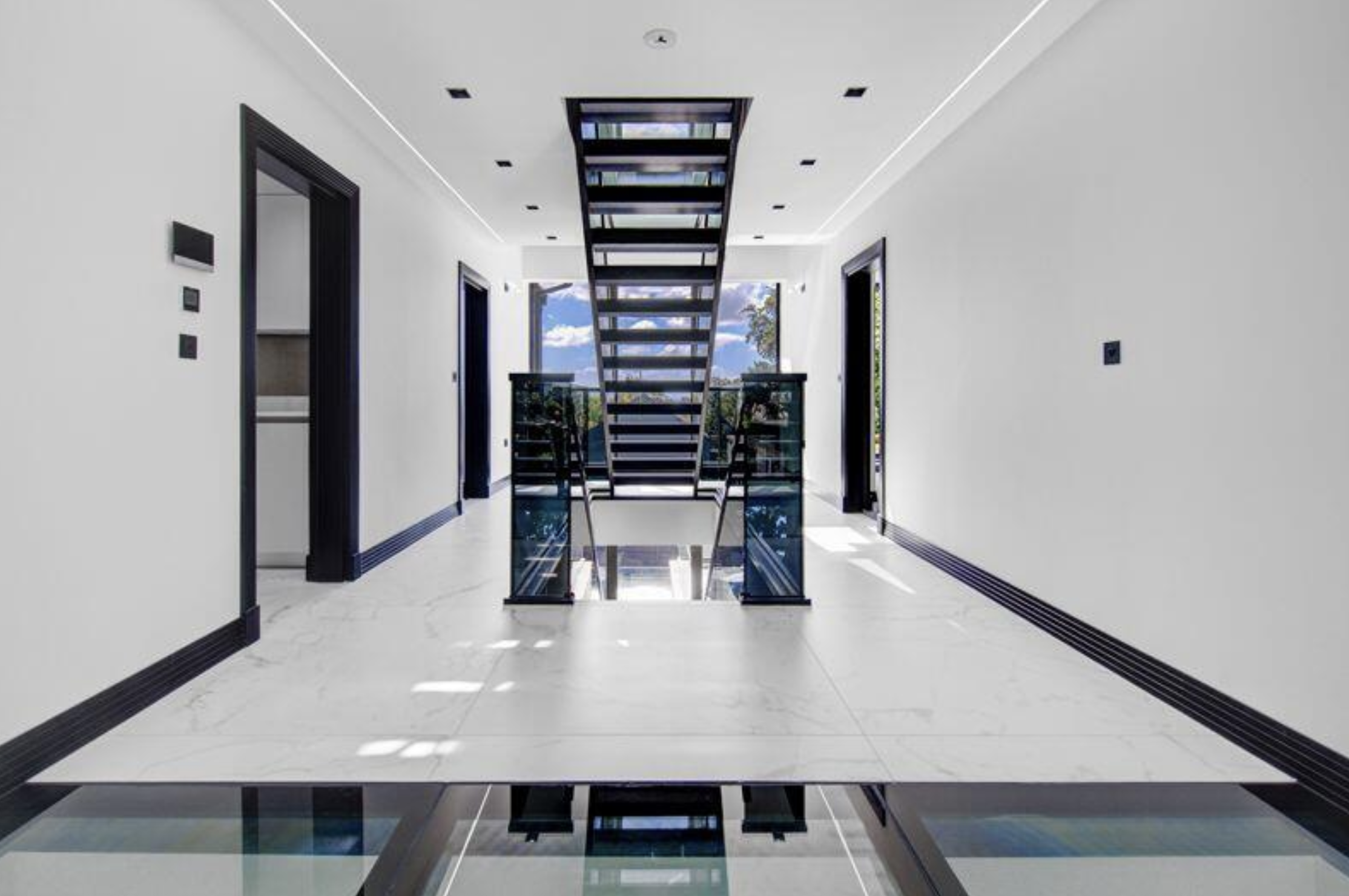 A hallway with stairs going up into the middle, but it looks like the floor is suspended above another floor that is glass and you can see through it.