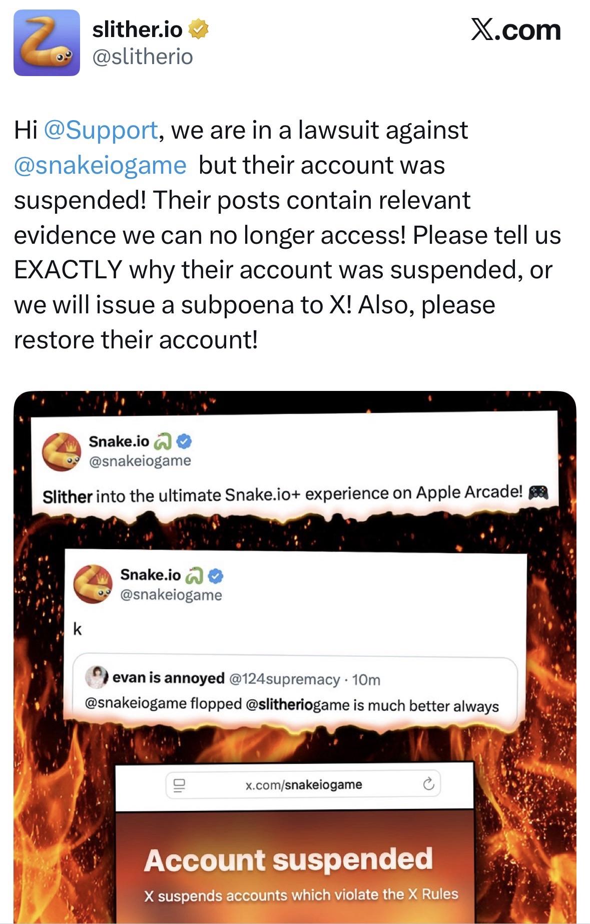 Crash out against Twitter support because the Snake.io Twitter account was suspended and they were using it in a lawsuit. They are threatening to subpoena Twitter