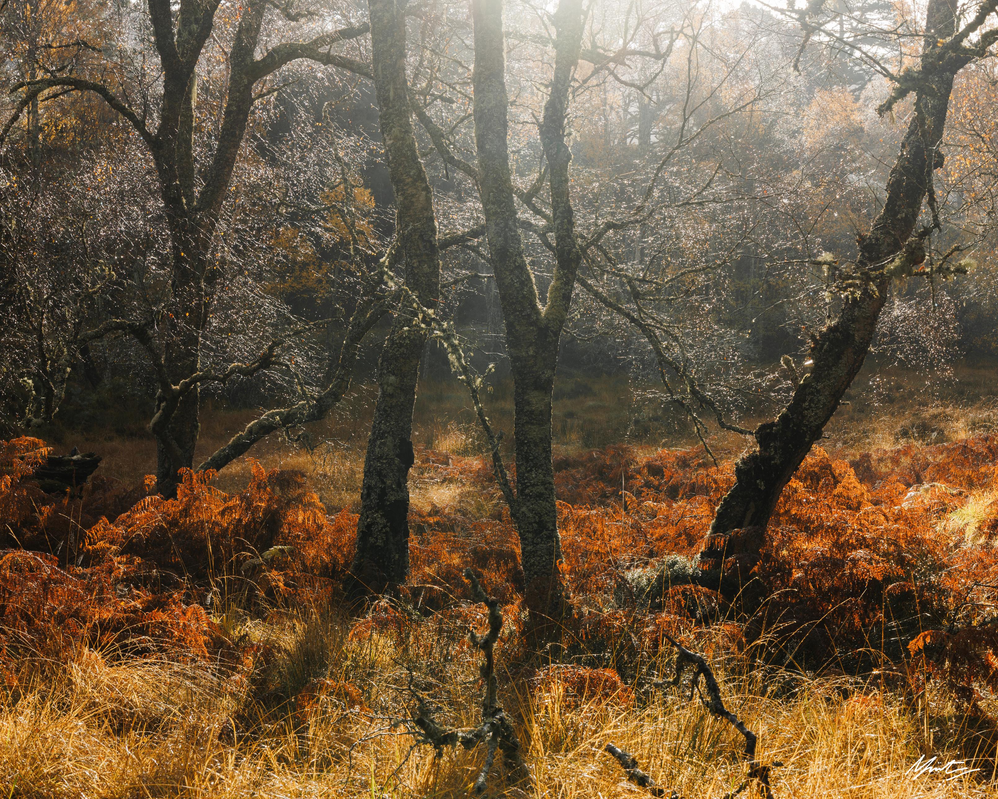 an autumnal scene from a birch woodland in scotland. backlighting spills through the dew laden trees illuminating golden grasses and bronzed bracken in the woodland understory. a rhythmic dance of 4 characterful birch trees are balanced across the frame