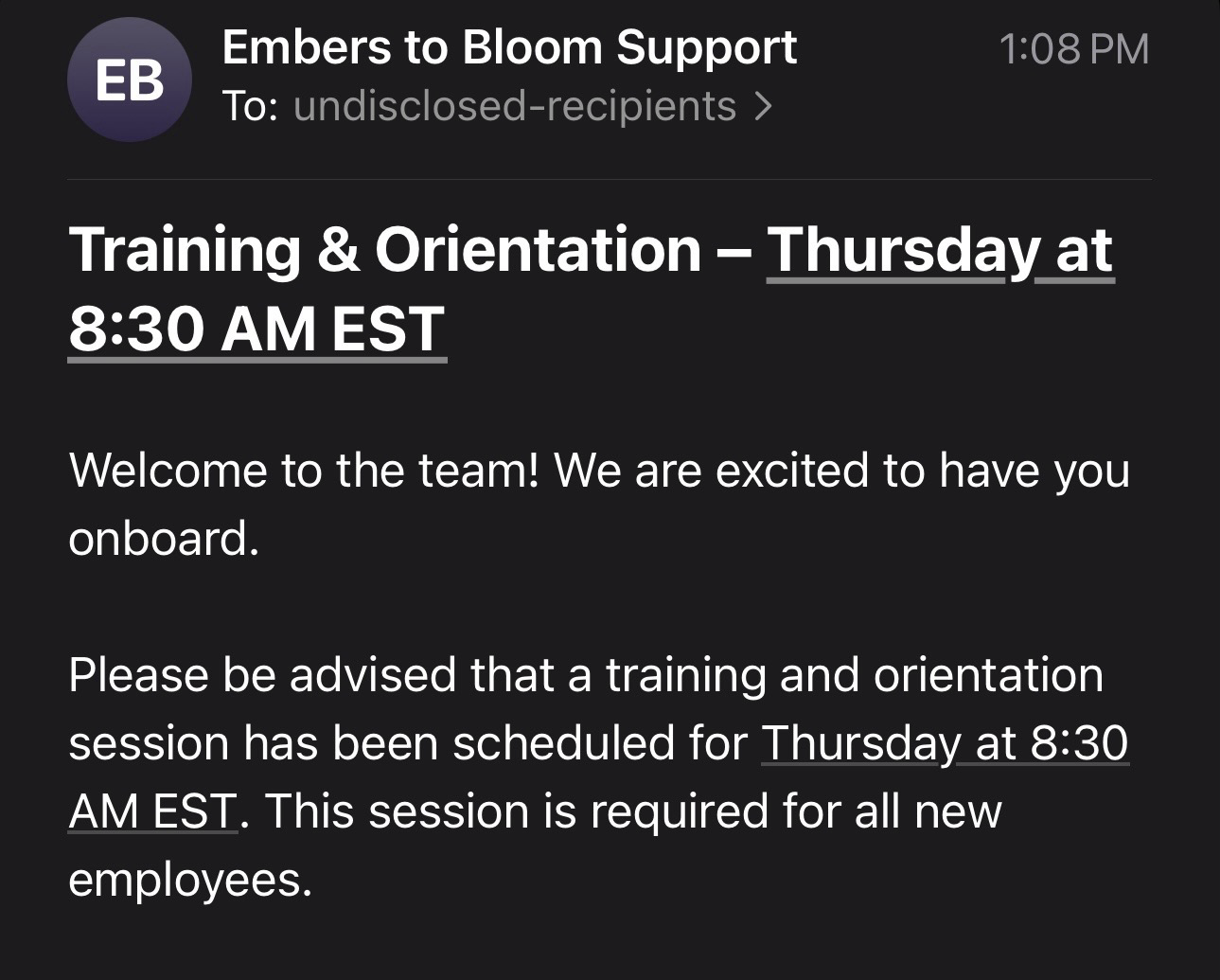 Training & orientation- Thursday at 8am est time. Welcome to the team! We are excited to have you onboard. Please be advised that a training and orientation session has been scheduled for Thursday at 8:30 AM EST. This session is required for all new employees.