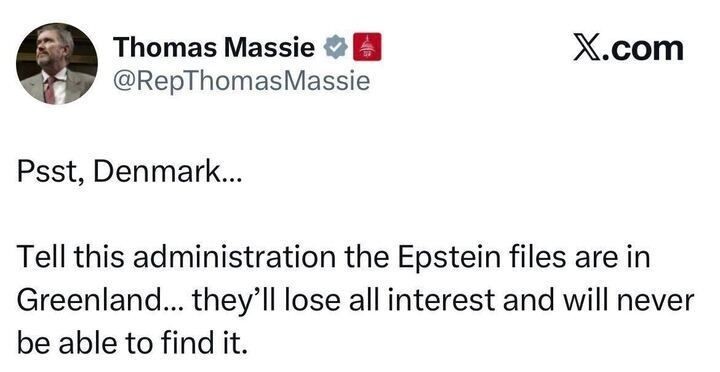 Screenshot of an X.com post by Thomas Massie that begins, βPsst, Denmarkβ¦β and jokes that telling the administration the Epstein files are in Greenland would make them lose interest and never find them.
