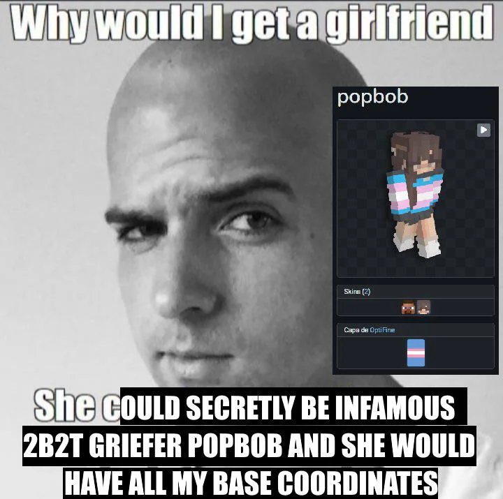 A black-and-white meme featuring a close-up of a bald man with a serious expression. To the right is an overlay of a Minecraft user profile for "popbob," showing a character skin wearing trans flag colors. White text at the top and bottom reads: "Why would I get a girlfriend. She COULD SECRETLY BE INFAMOUS 2B2T GRIEFER POPBOB AND SHE WOULD HAVE ALL MY BASE COORDINATES."