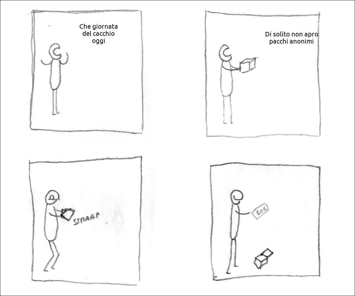 un tizio dice: «Che giornata del cacchio oggi» un tizio ha in mano un pacco e dice: «Di solito non apro pacchi anonimi» il tizio apre il pacco il tizio ha estratto dal pacco una banconota da 10€