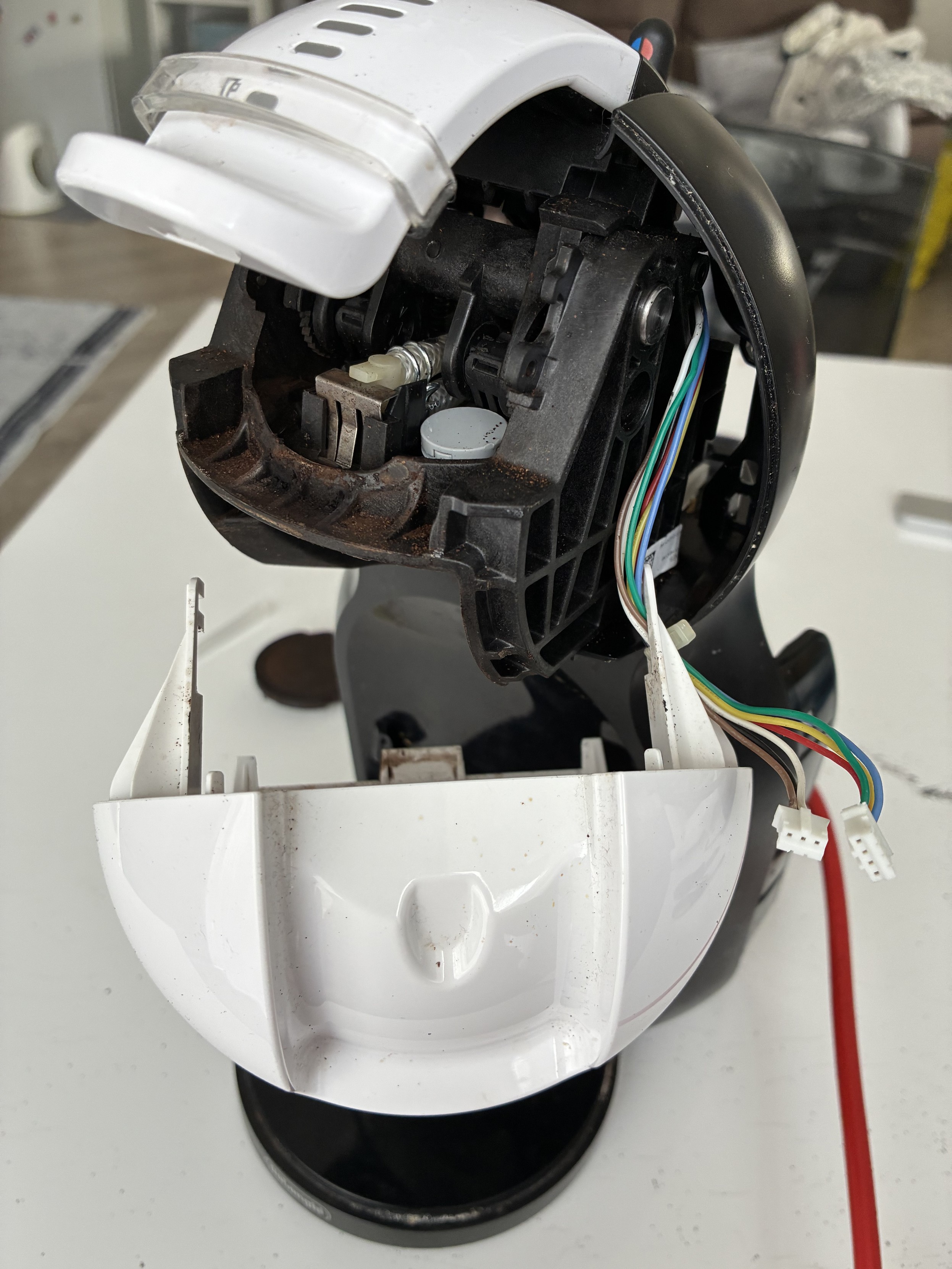 Macchinetta del caffรจ aperta con un pezzo di lego grigio rotondo in mezzo