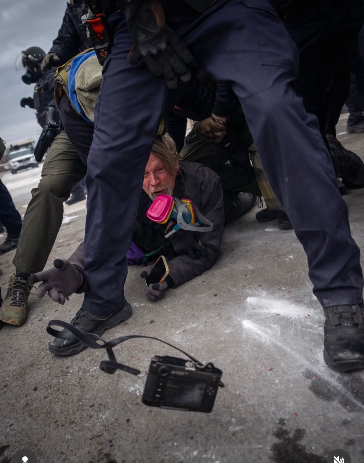 Getty photojournalist John Abernathy is seen face down on ground pinned & surrounded by federal agents. His arm is outstretched & his camera is midair as he tossed it to another photographer so it wouldn't be confiscated. Photo by Pierre Lavie.