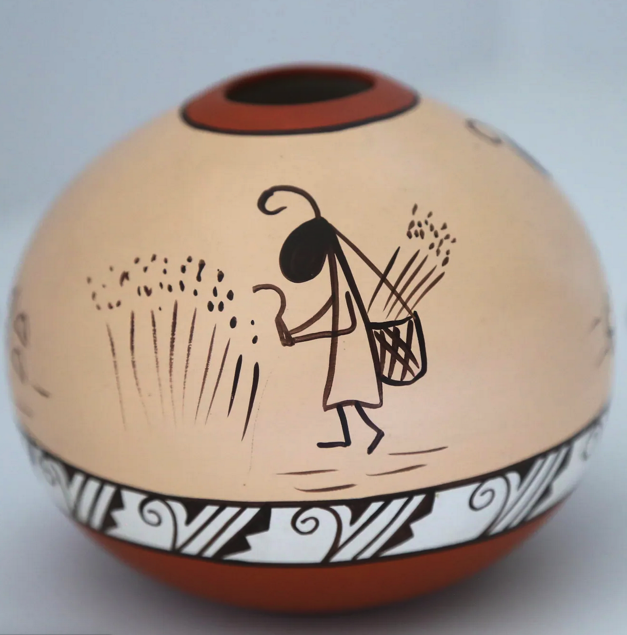 A traditional red, beige, black and white southwestern american vase. The pattern is a simple hand painted ant harvesting wheat with a basket on her back.