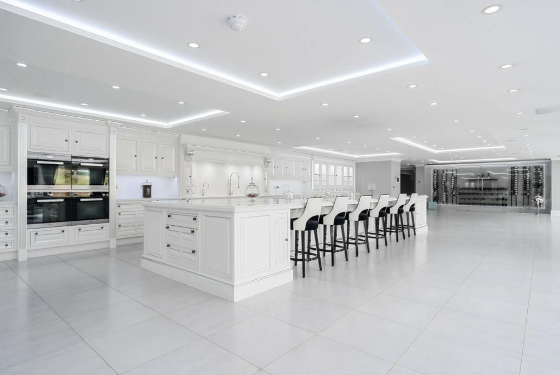 A large white kitchen in a huge open plan room with white tiles. There is an inordinate amount of empty space.