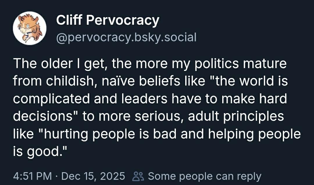 The older I get, the more my politics mature from childish, naΓ―ve beliefs like "the world is complicated and leaders have to make hard decisions" to more serious, adult principles like "hurting people is bad and helping people is good."
