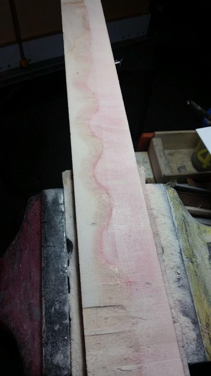 Un pezzo di compensato sul quale Γ¨ stato usato alcool denaturato per sciogliere la colla vinilica. L'alcool ha lasciato giΓΉ il colore e un lato del compensato Γ¨ rosa.