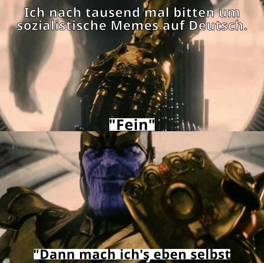 Thanos meme, oberes panel "ich nach tausend mal bitten um sozialistische memes auf deutsch" - "fein" - unteres panel, "dann mach ich's eben selbst." *thanos zieht handschuh an*