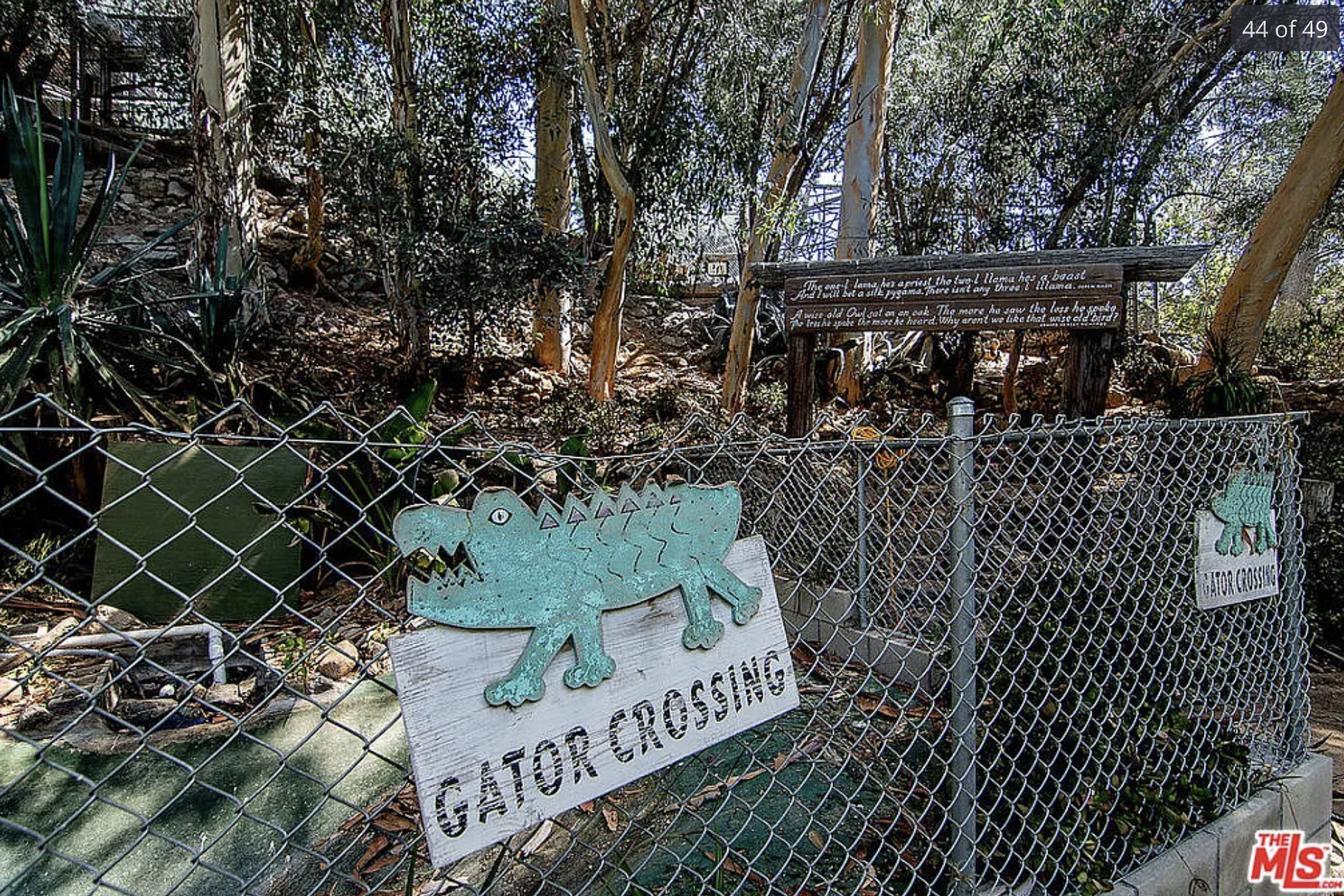 A sign that says Gator Crossing, it is crudely made out of wood and on a chain link fence.