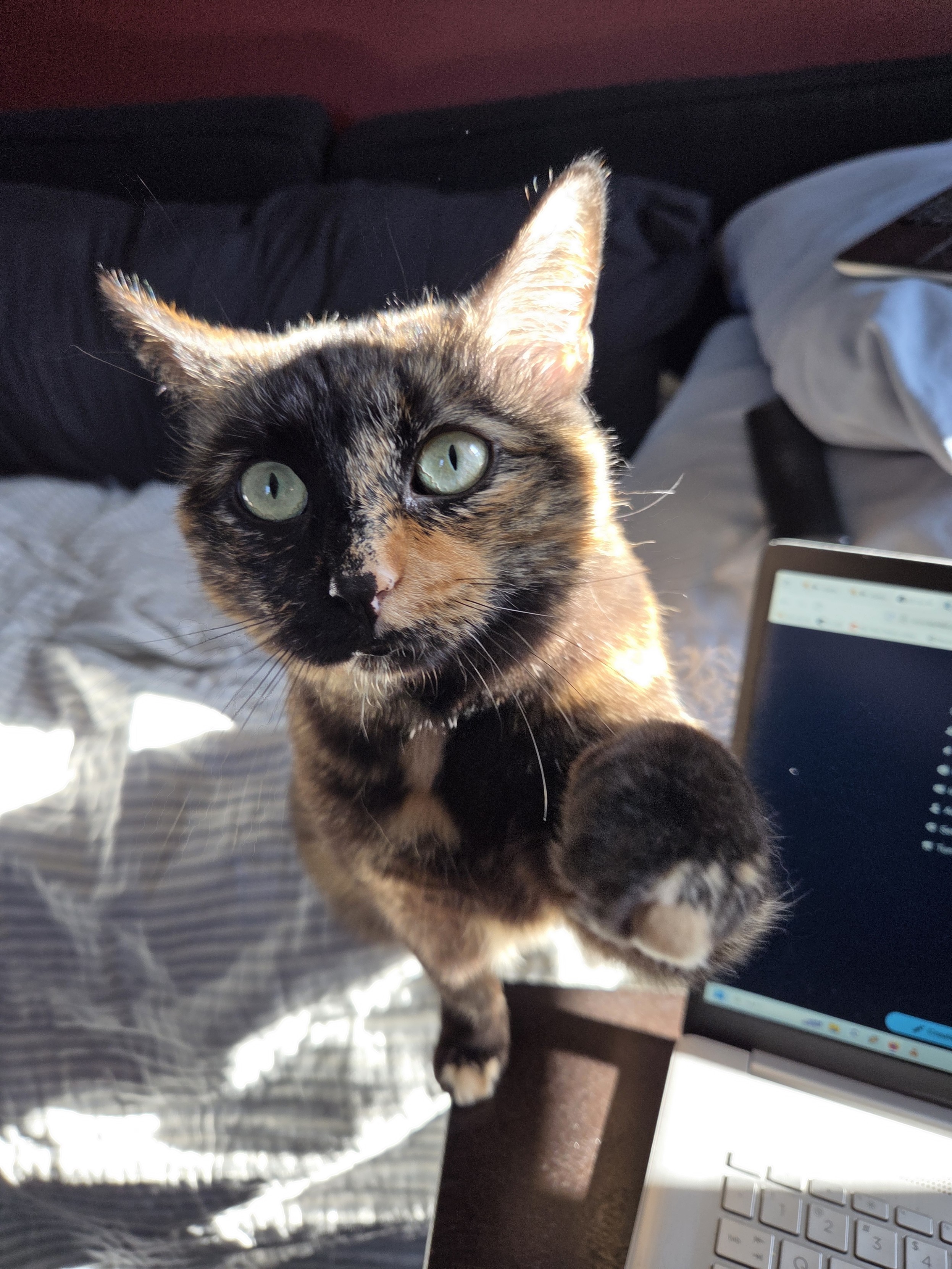 Minerva, a tortoiseshell cat, standing on my endtable next to my laptop, reaching out to grab my phone.