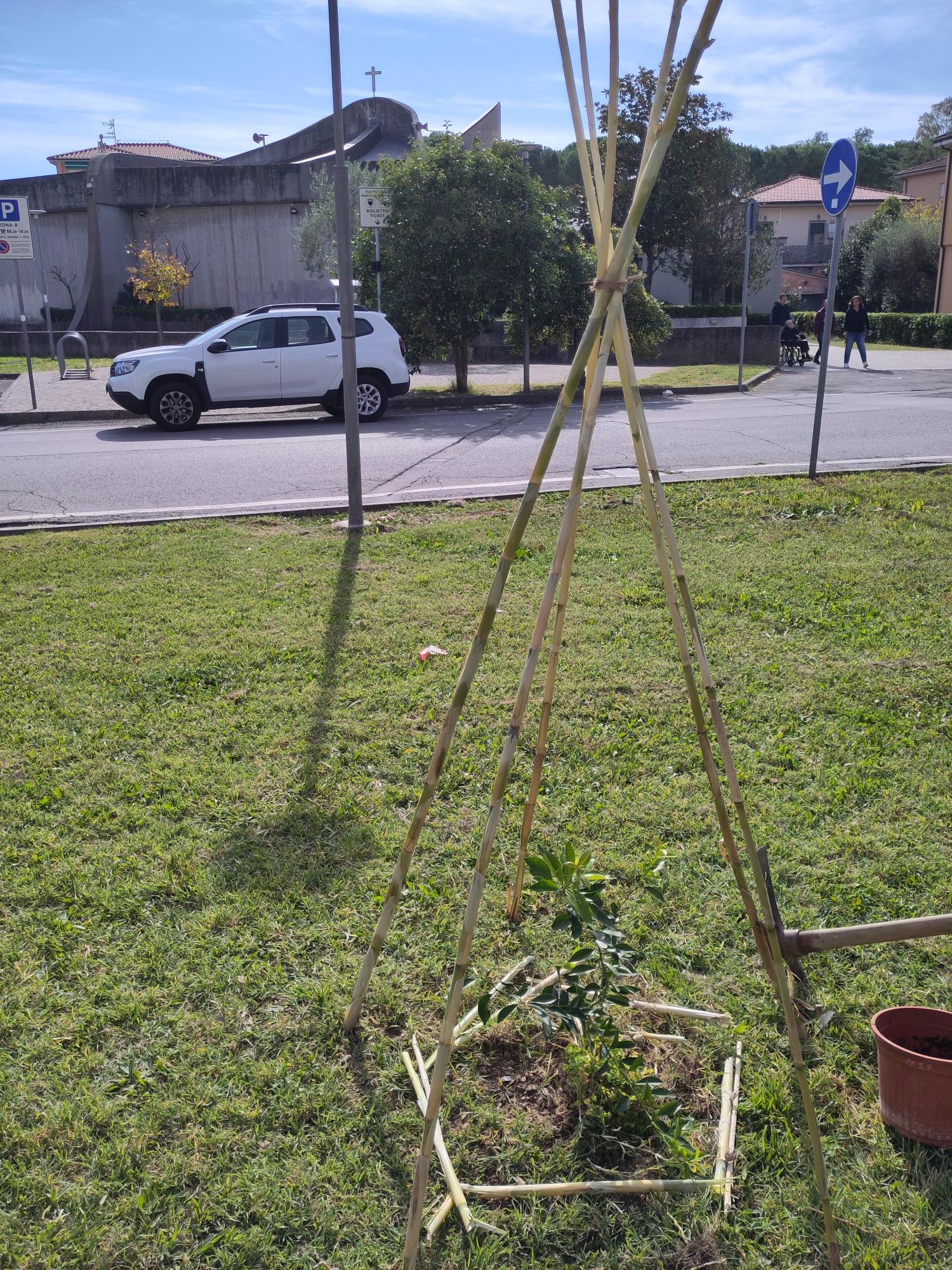 Un giovane mandarino sotto una struttura di cannicci. Sullo sfondo, la chiesa brutalista di Santa Maria Madre della Chiesa a Pisa.
