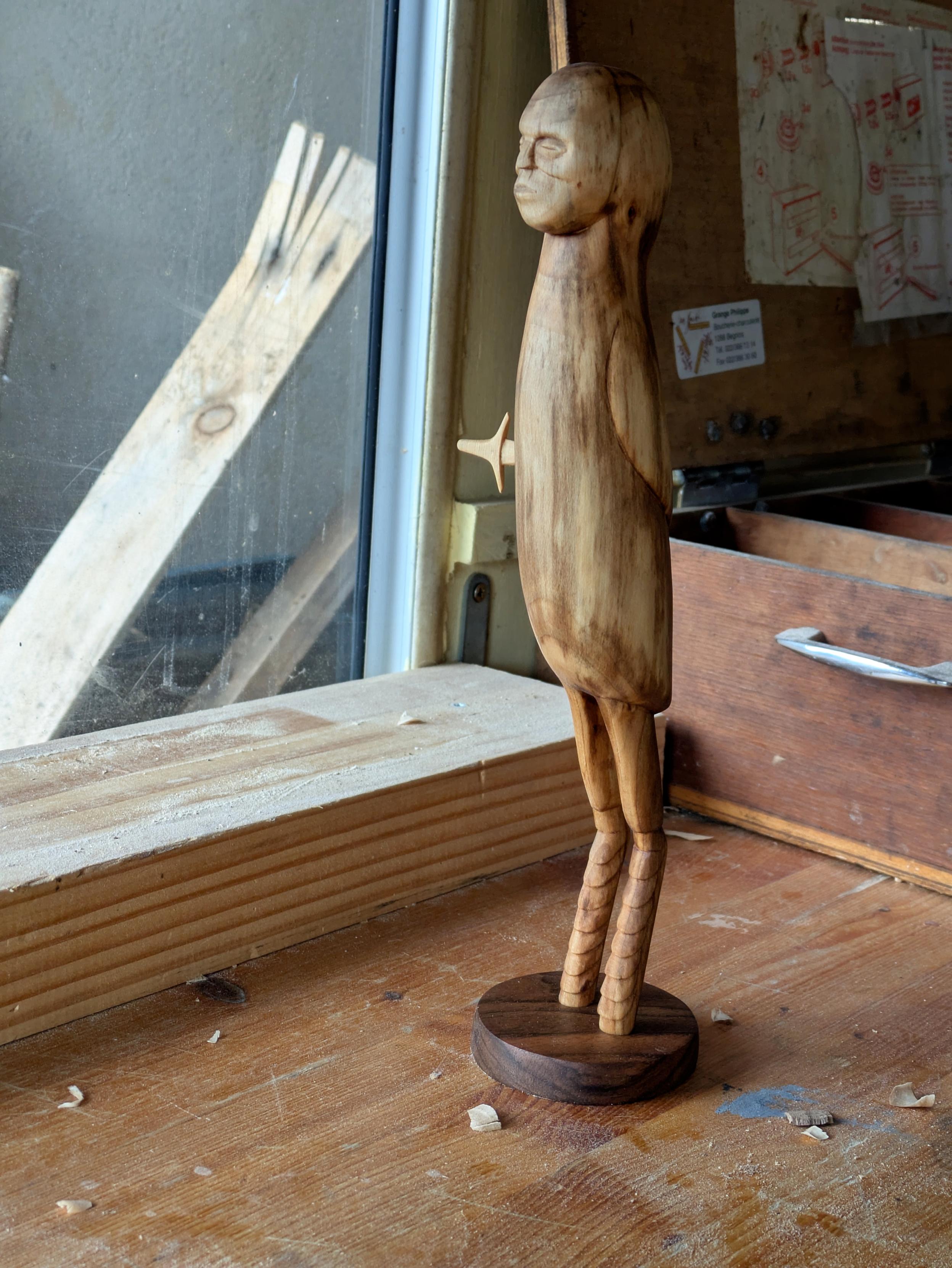 Woodcarved creature. A weird bird with a human face mask. A long body, very long legs, small wings. A dagger is wounding it in the chest. Its legs are planted on the base, no feet visible.