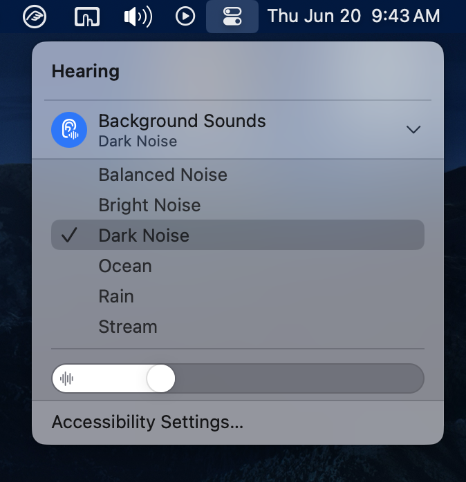 Screenshot of the macOS hearing accessibility menu, with options for different white noise background sounds that can be selected. Dark Noise is selected, and a volume slider is at the bottom of the window.