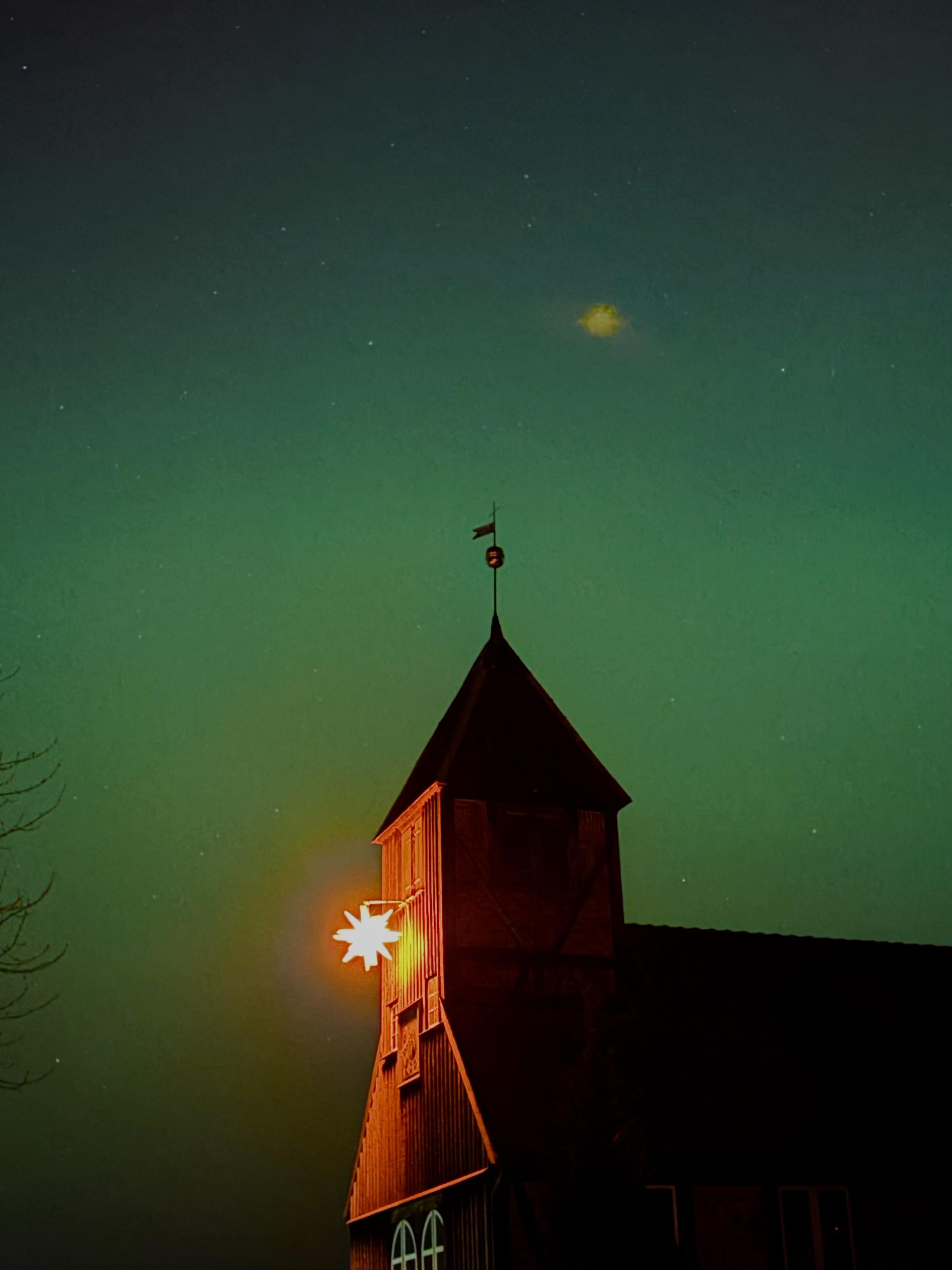 Eine Silhouette eines Kirchturms vor einem von grΓΌnen Polarlichtern beleuchteten Nachthimmel,
