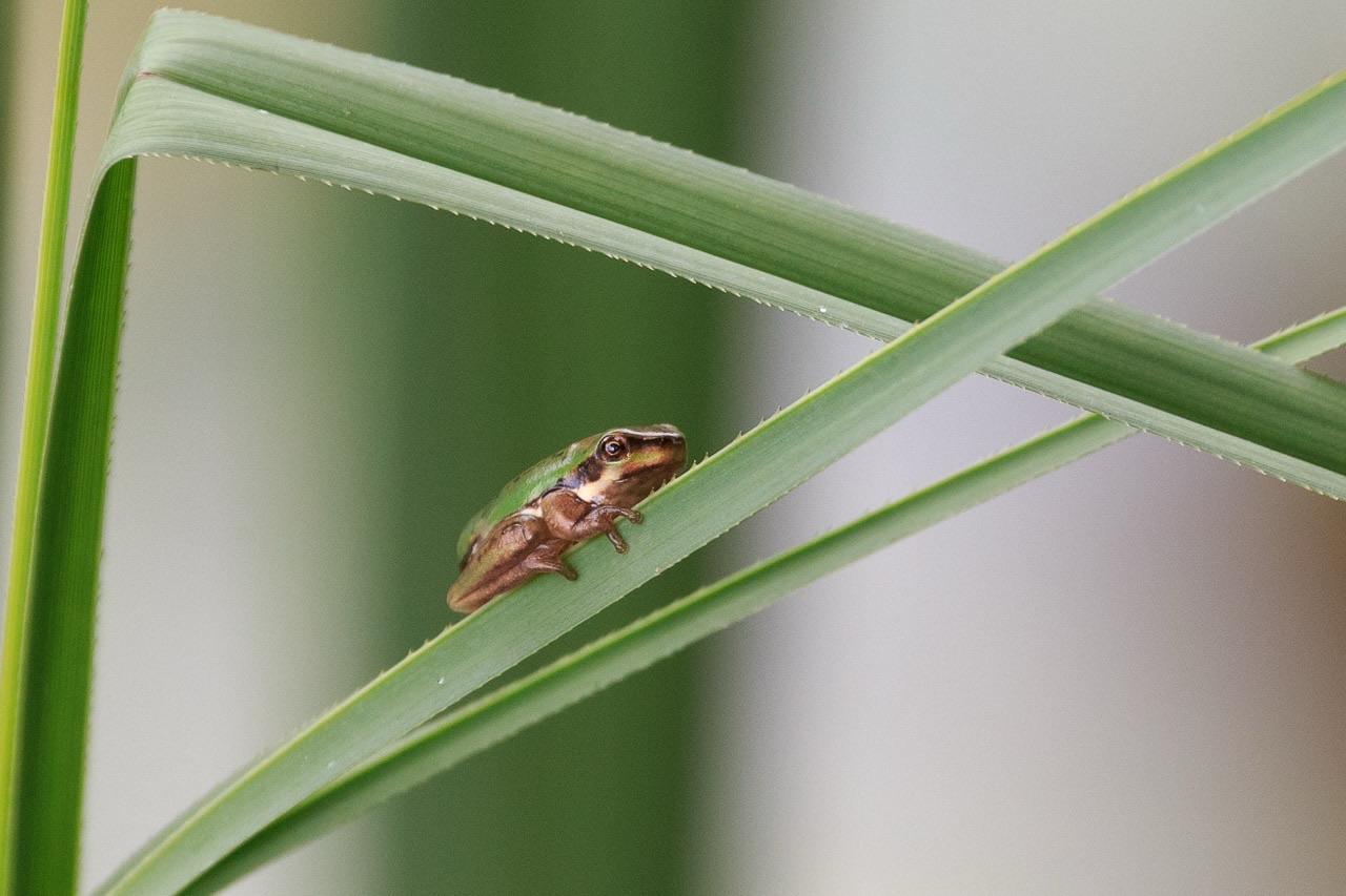 A very small frog with a green back and brown side-trim and lighter belly on a reed leaf. There is a vertical reed leaf on the left of frame that bends in a diagonal near the top left corner down towards the middle right. The leaf with the frog on it originates in the bottom left corner and terminates in the top right.