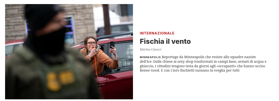 Fischia il vento Marina Catucci Minneapolis Reportage da Minneapolis che resiste alle squadre naziste dellโIce. Dalle chiese ai sexy shop trasformati in campi base, armati di acqua e ghiaccio, i cittadini tengono testa da giorni agli ยซoccupantiยป che hanno ucciso Renee Good. E con i loro fischietti suonano la sveglia per tutti