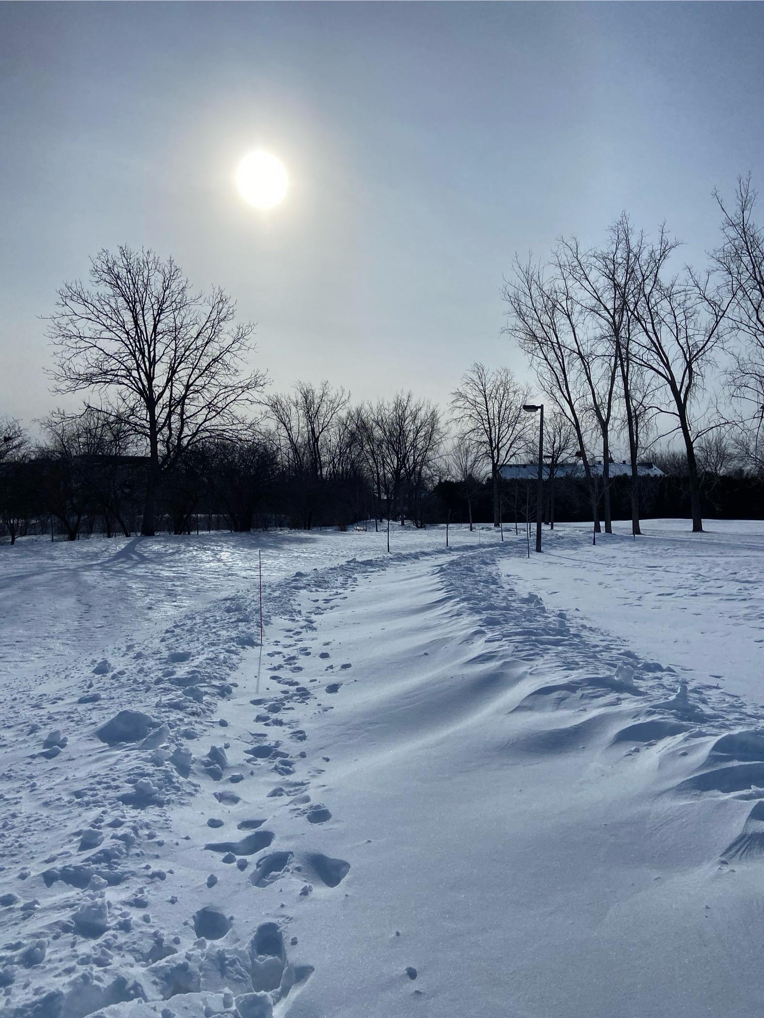 A snowy path curves through a field. The sun is bright in a hazy sky, and there are bare tree silhouettes in the distance. This is an asphalt path that was cleared after one snow storm, but not after the most recent snow storm. So we can see clearly where the path is, without a single trace of asphalt. The fresh and drifted snow slope down from the plowed mounds on the sides.