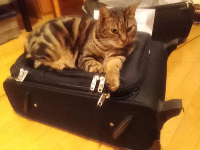 Una foto a colori, in formato orizzontale, che ritrae Arturo, il mio micio, che ho già descritto nella foto precedente, accoccolato sopra un trolley nero appoggiato in orizzontale su un pavimento di parquet.