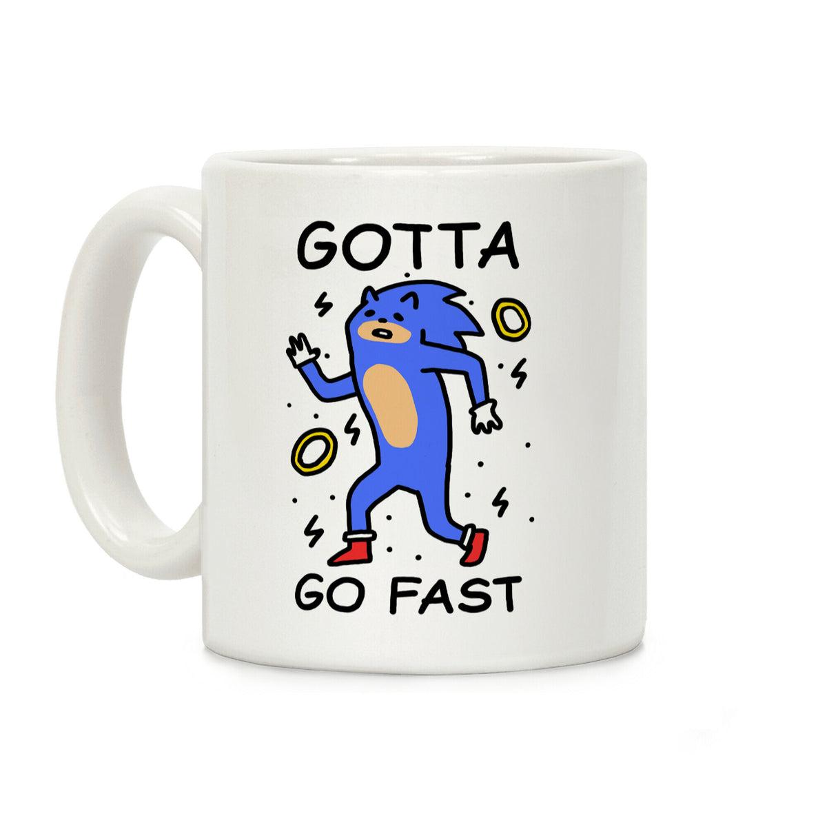 A white mug with a wonky looking Sonic the Hedgehog on it. It says Gotta Go Fast.