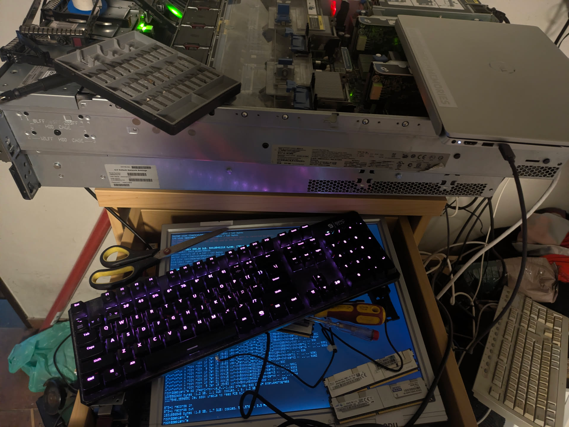 a disheveled server without the top cover, atop of another server, with a loose collection of tools, caddies and a laptop disordered atop the server, along with a keyboard resting on a powered vga screen (the KVM™) in a drawer under the server