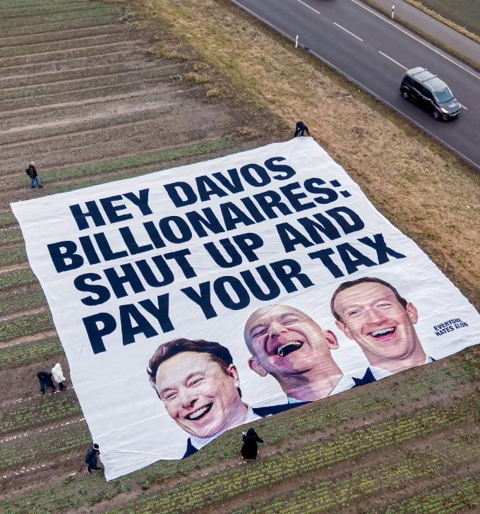Aerial photo of a huge protest banner laid out on a farm field near Zurich Airport, directly under the flight path to the Davos conference. The white banner reads βHEY DAVOS BILLIONAIRES: SHUT UP AND PAY YOUR TAXβ in bold black letters, with large laughing portraits of Elon Musk, Jeff Bezos, and Mark Zuckerberg printed along the bottom. Several small figures stand around the edges holding it down, while a road with a passing car runs alongside the field. The banner is signed βEveryone Hates Elon.β