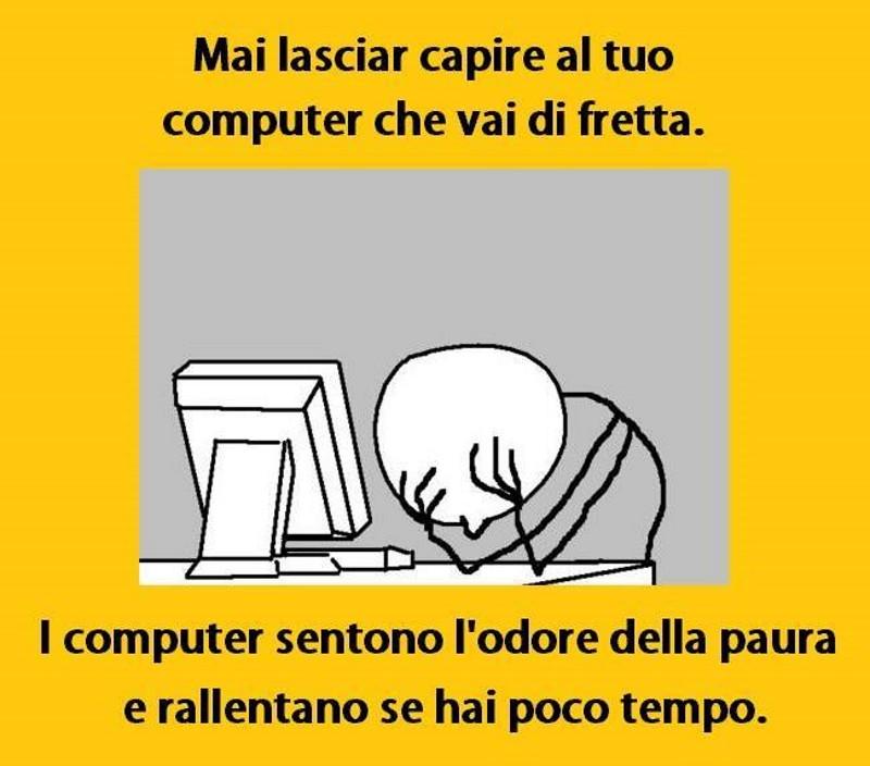 Vignetta: umano davanti ad un pc con la testa fra le mani. Scritta: mai lasciar capire al tuo computer che vai di fretta. I computer sentono l'odore della paura e rallentano se hai poco tempo.